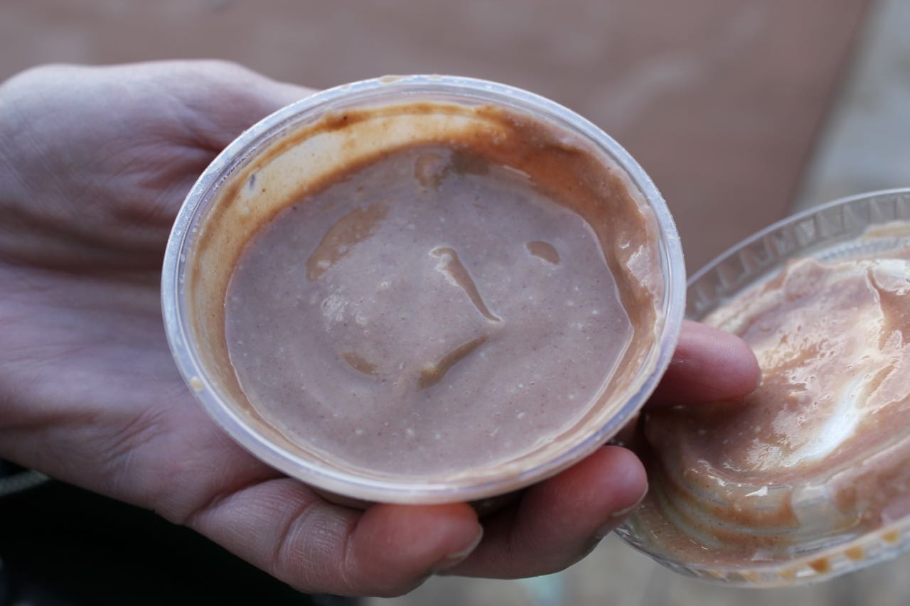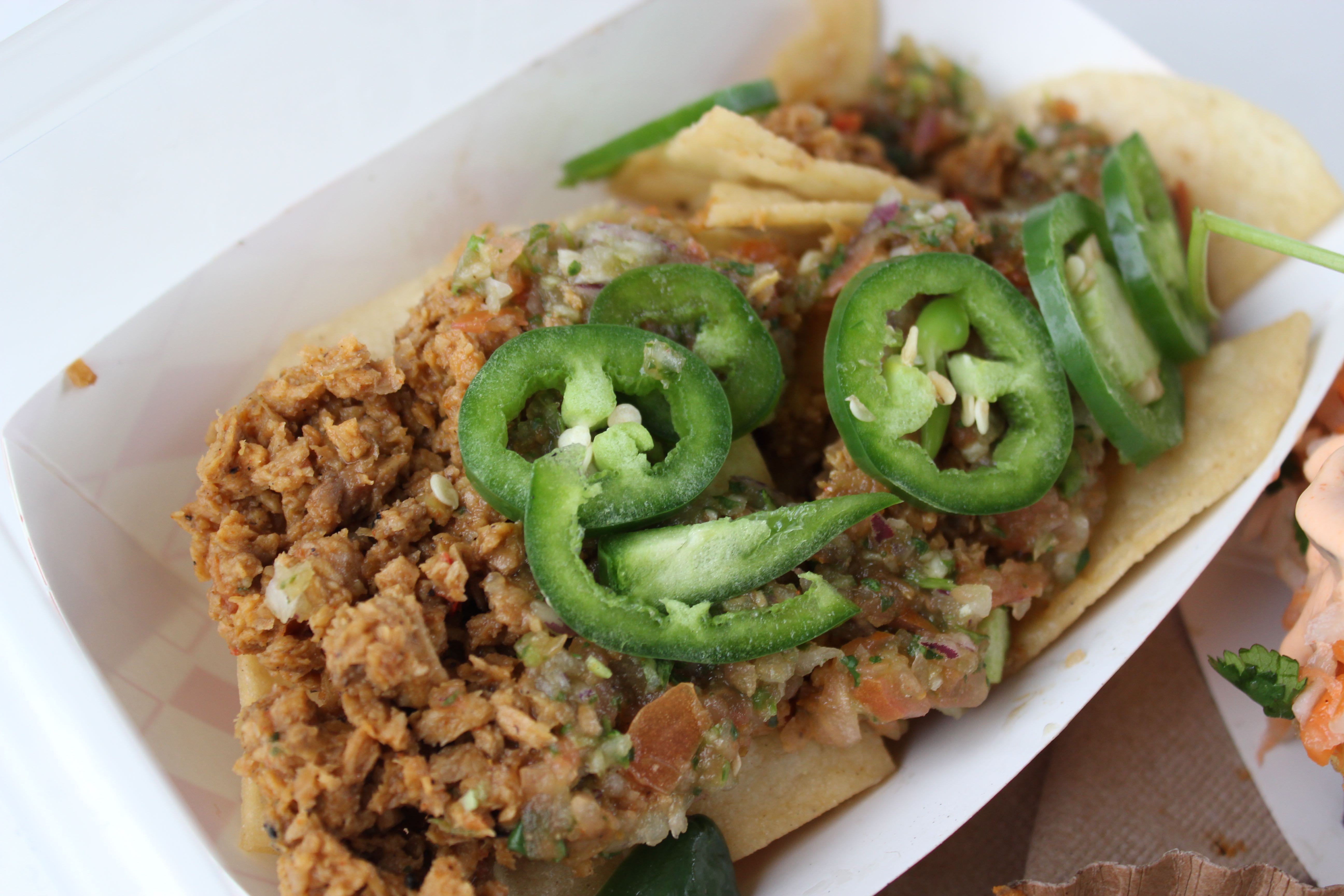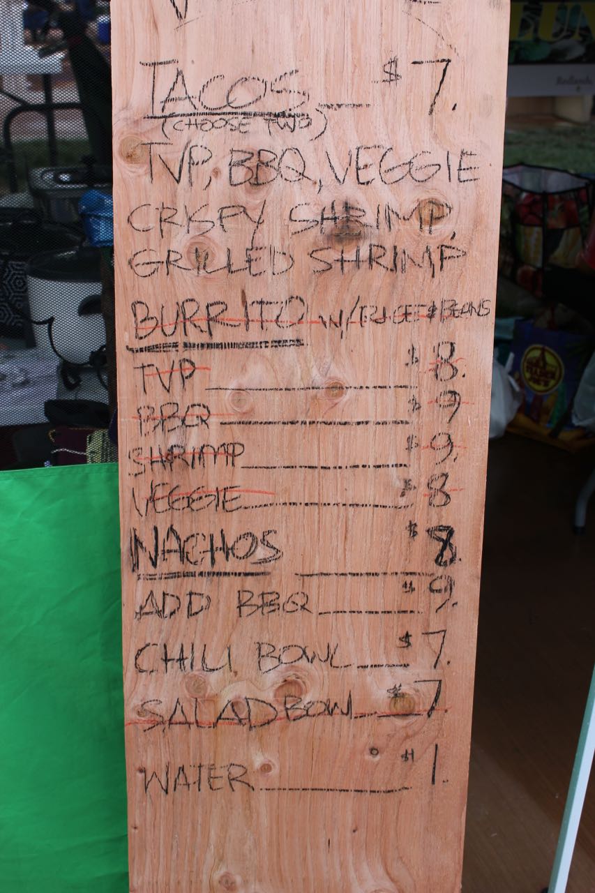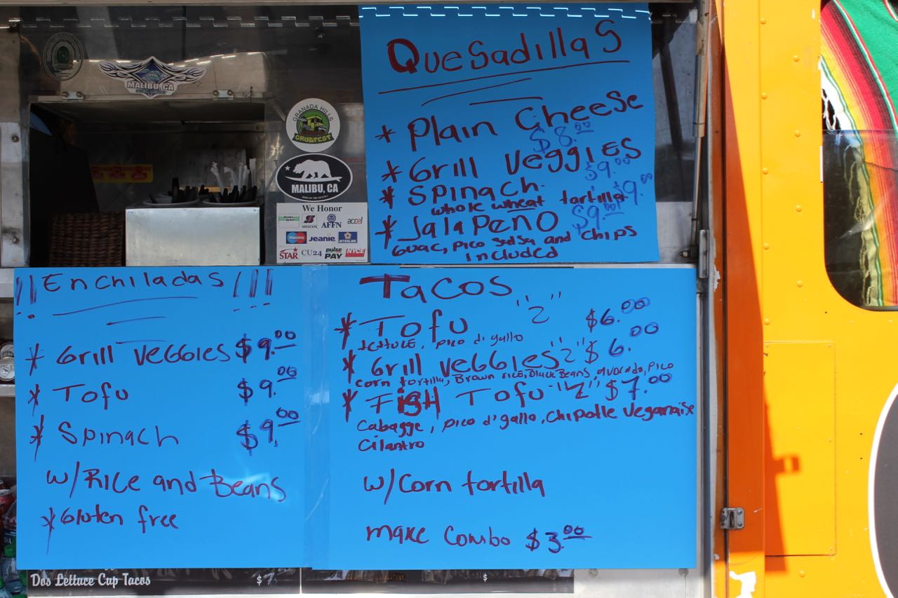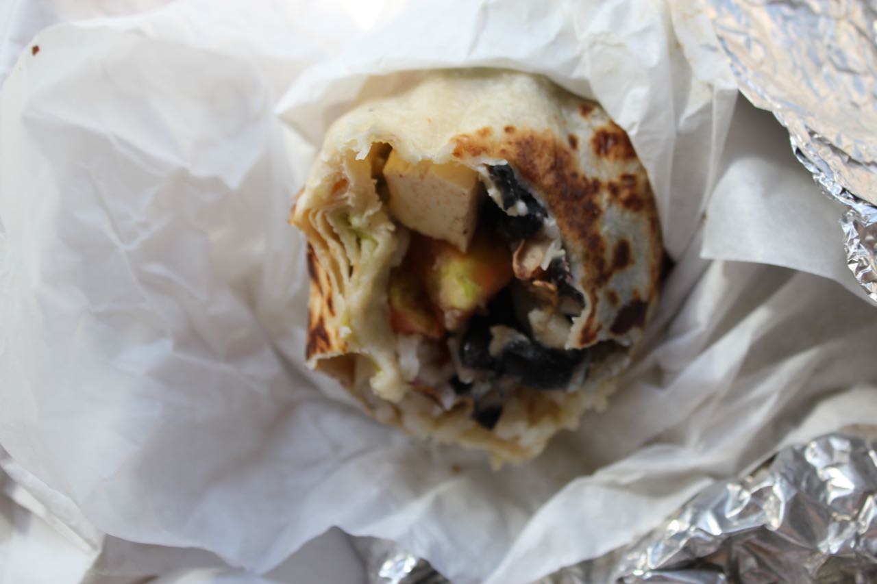 Stop 4: Sabores de Mexico looks like they serve all meat during their normal truck schedule, because they put up some (very hand-made) signs with a special vegan menu for the event. I really appreciate the effort, but unfortunately, I was not a fan. I got the Pepperdine Burrito which had rice, beans, pico de gallo, guacamole, Daiya, and tofu. I thought it was a little bland. Adding Spanish rice instead of plain ol’ white rice might have helped.